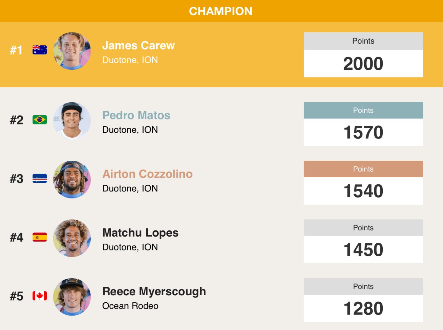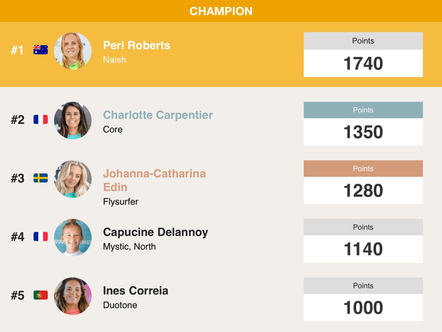 All riders will also have a discard. If they have missed one event (such as the event in Cape Verde) or, had a bad result in one of the events this year, this will not count towards their overall ranking for 2021. Only the riders three best results will count towards the overall ranking.