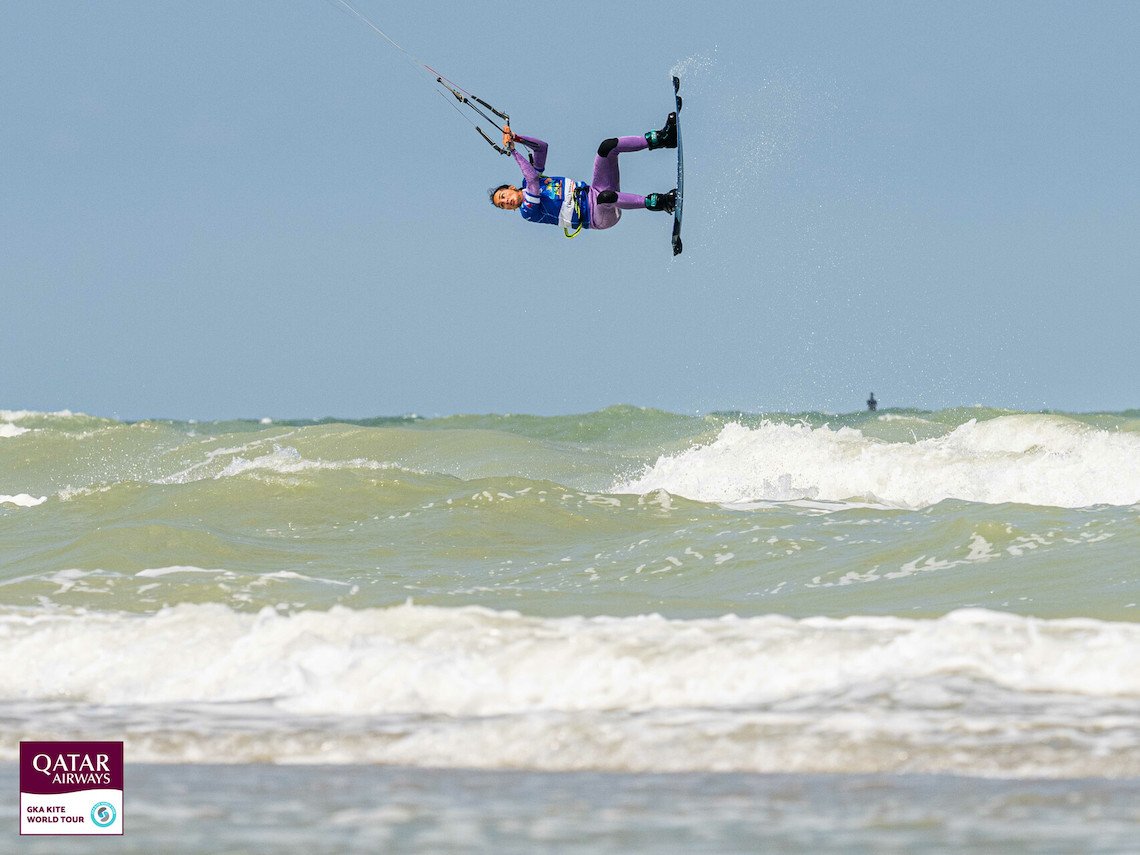 Brazil’s Bruna Kajiya won the women’s competition on day two with stellar riding that takes her to the top of the rankings with just two more freestyle discipline stops remaining on the Qatar Airways GKA Kite World Tour.