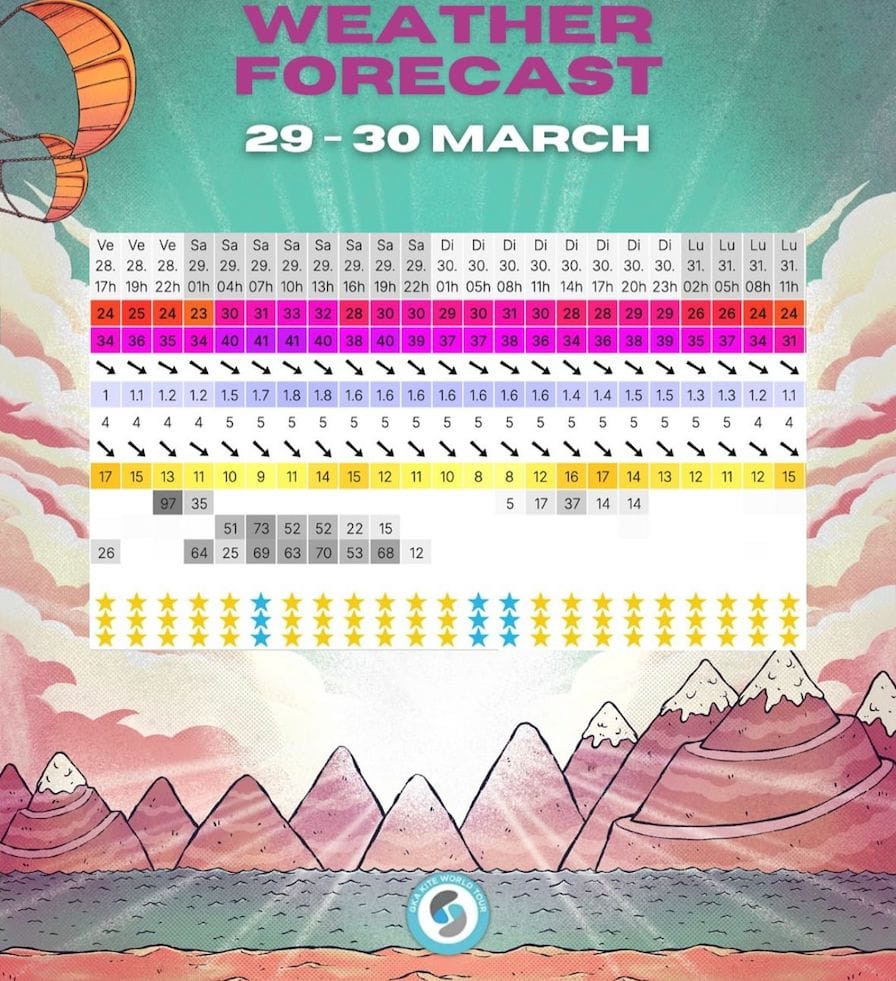 If the prediction for the conditions holds steady the status will be changed to a “Green” light indicating, as seems probable, that the battles among the 24 men and 12 women will be begin in Barcarès, France, on Saturday, 29 March.